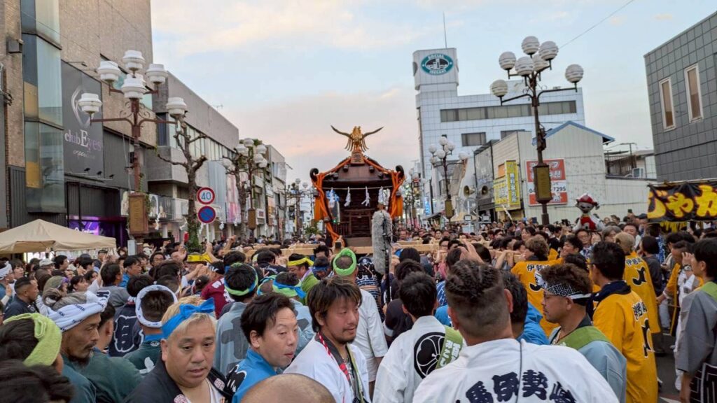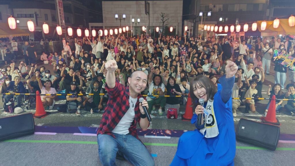 日曜日はアンパンマンショーからスタートし、まんてん紙芝居の会による紙芝居公演を挟んで2部構成で行われました。おまつり広場のステージで郷土芸能発表が行われているころ百人みこしの渡御がはじまり、こちらでも多くの青年会議所メンバーが活躍していました。最後のステージはものまねタレントパフォーマンスショーが行われ、本物さながらの歌声とパフォーマンスで2日間の祭の締めに相応しいものとなりました。