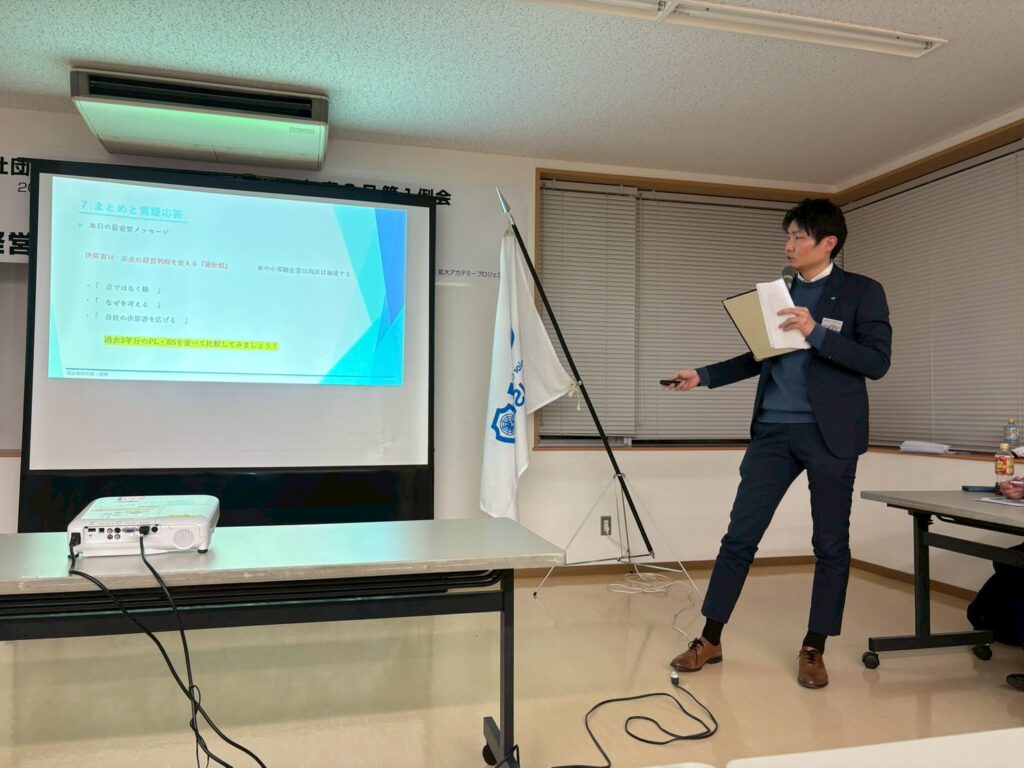 本例会は当会メンバーの税理士と信用組合職員の2名が講師を務め、会社経営に役立つ会計の基礎を学びました。メンバーを対象とした研修例会として設営しましたが、非常に学びになる内容だと考えたため、当会に入会していない方でもご参加いただけるようにいたしました。当日は、メンバー以外にも15名の方にご参加いただき盛大に開催することができました。ご参加いただきました皆様、誠にありがとうございました。
